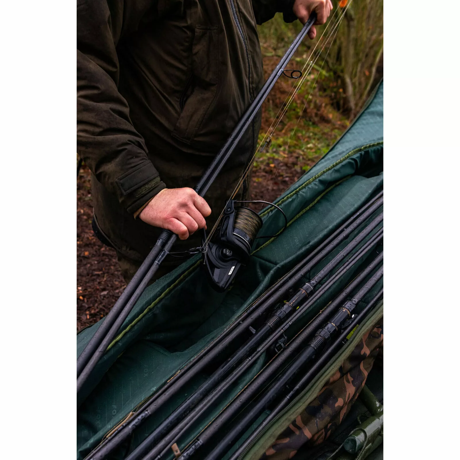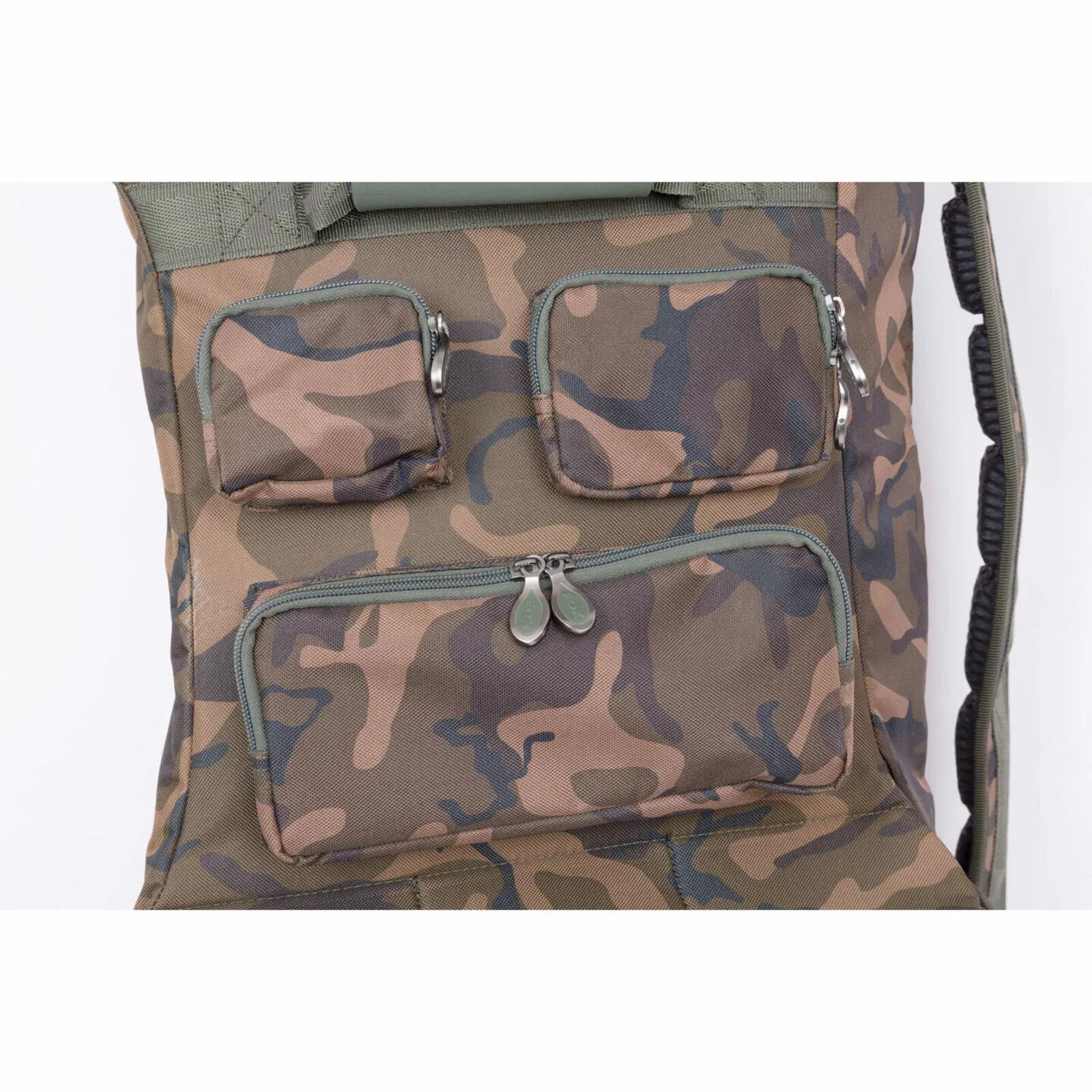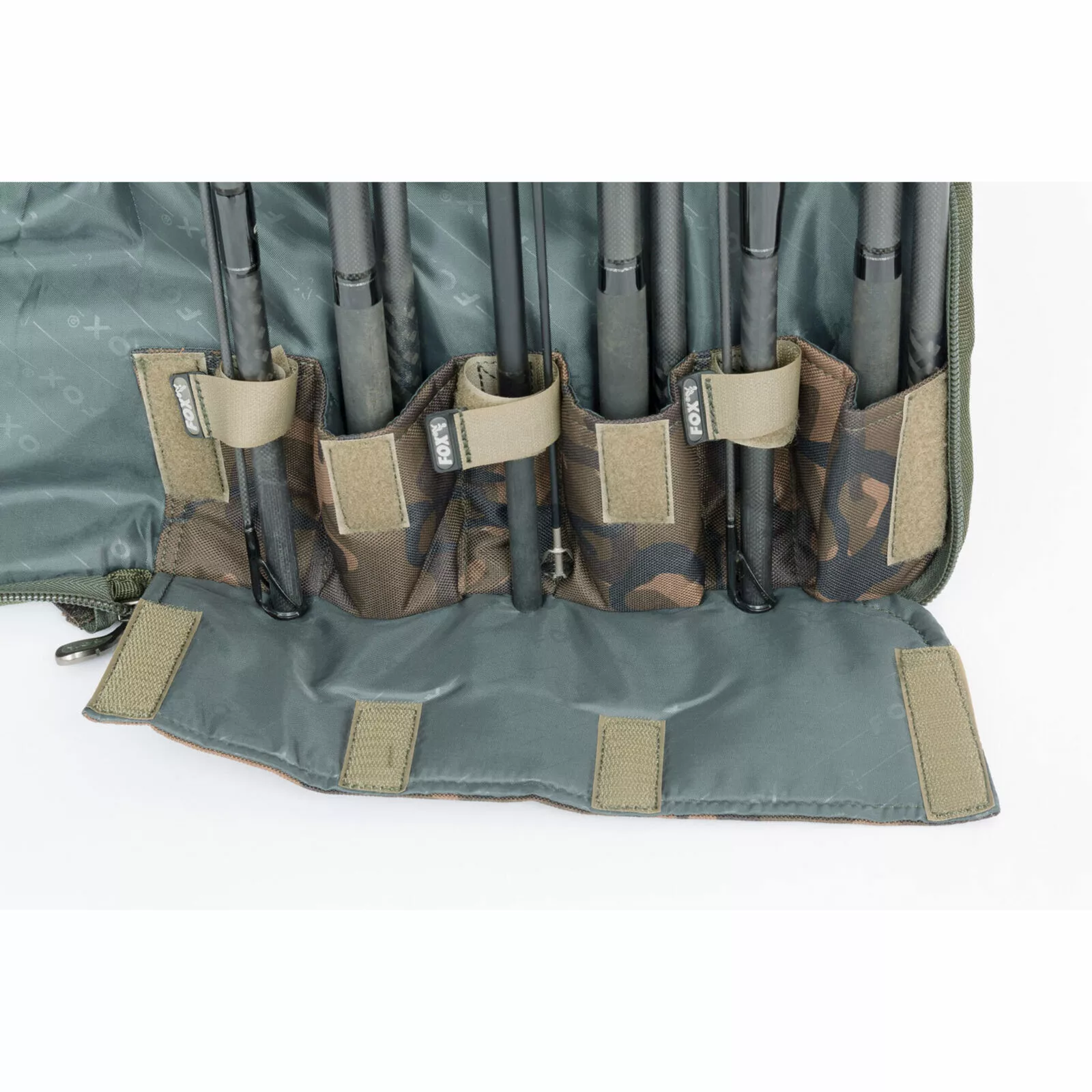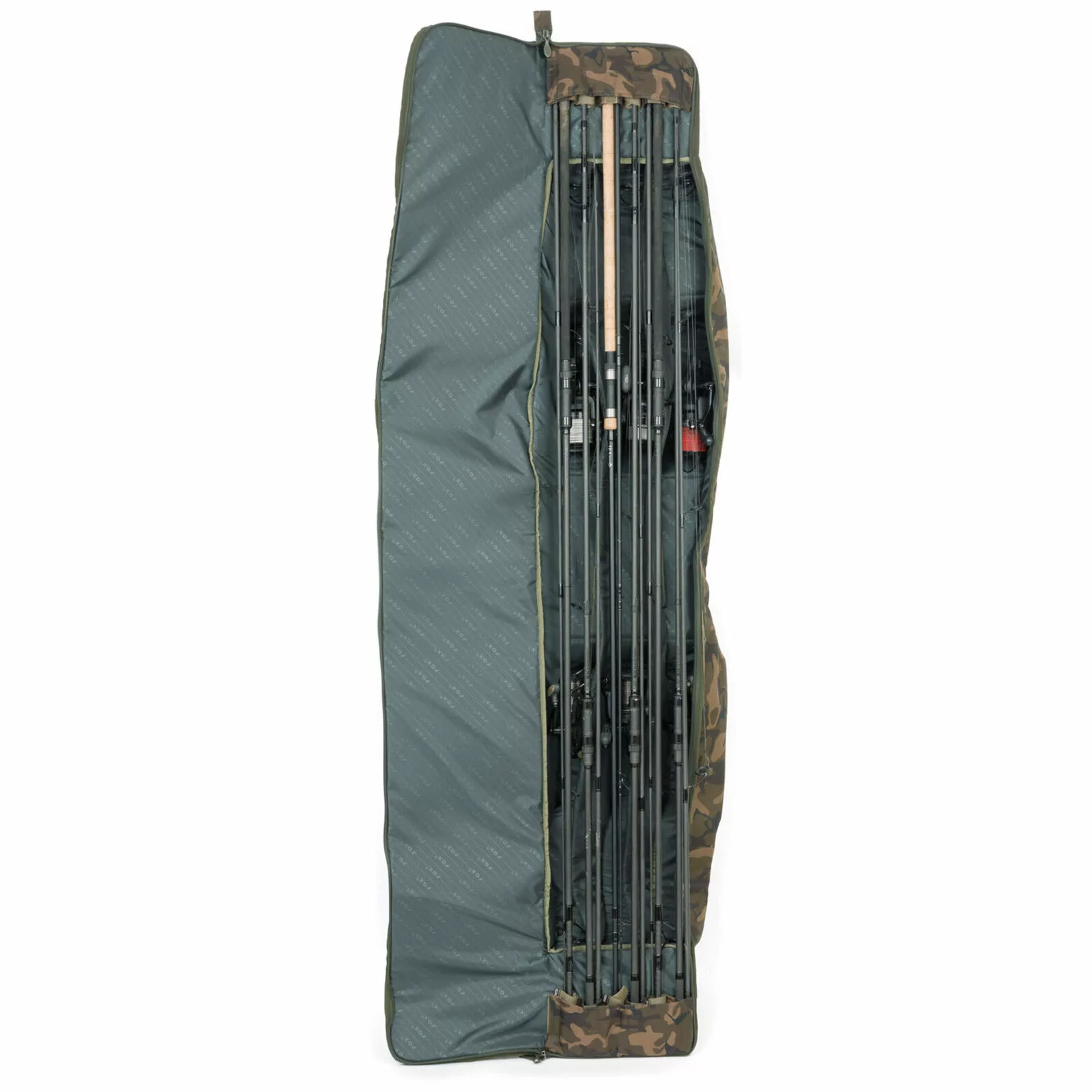 De Camolite rod case is gemaakt van 100% behandeld 500 Denier polyester en voorzien van het Fox Camo patroon. Door het unieke ontwerp is er maximale ruimte voor hengel en molen, zelfs voor de grotere big pit molens en startogen. Op belangrijke stukken is er extra versteviging aangebracht. Denk hierbij aan molen en geleideogen. Hengels passen in de case met de molen en geleideogen naar beneden gericht. De Rode Case is voorzien van een groot extern vak voor landingsnet.