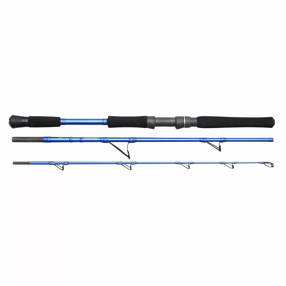 Deze hengel is een echt krachtpatser voor het vissen op het zoute water. De hengel heeft genoeg kracht om de vis onder druk te houden. Mocht de vis een harde run nemen zal de hengel mooi mee buigen waardoor een lijnbreuk uit zal blijven. Alle geleide ogen zijn dubbel potig uitgevoerd wat er voor zorgt dat mocht de lijn er omheen draaien het geleide oog niet af zal breken. Het stevige Eva handvat zorgt voor veel grip tijdens het drillen van de grootste vissen en geeft in combinatie met het mooie blauw de hengel een fantastische uitstraling.